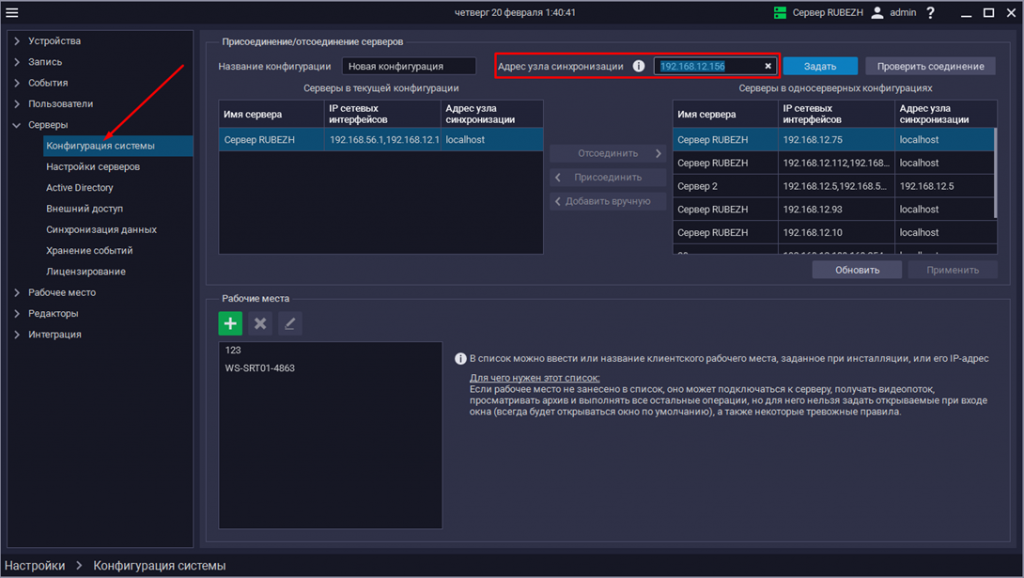 Для его настройки необходимо подключиться клиентом R-Operator к главному серверу, зайти в настройки пункт меню «Серверы» - «Конфигурация системы» и указать адрес узла синхронизации, нажать кнопку «Задать».