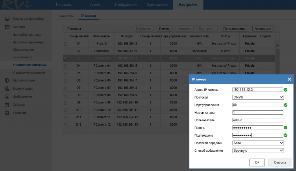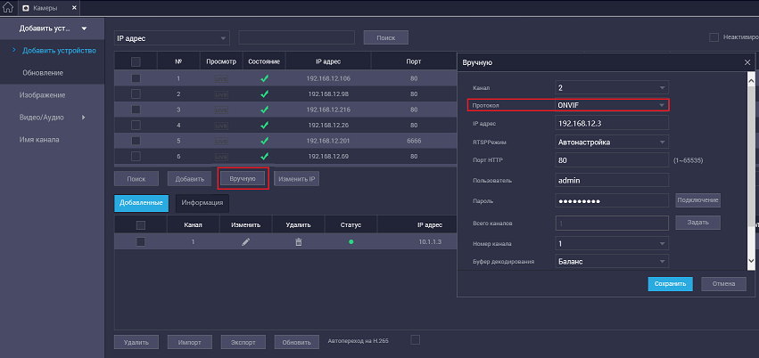 Добавление устройств по протоколам Private, Onvif и RTSP в регистраторы
