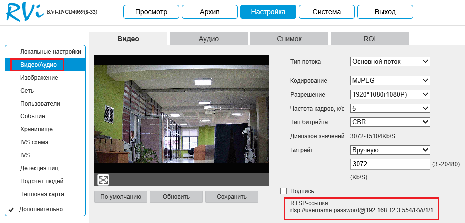 Задайте порт RTSP (по умолчанию имеет значение 554, но может отличаться). Для основного потока RTSP ссылка опять же будет