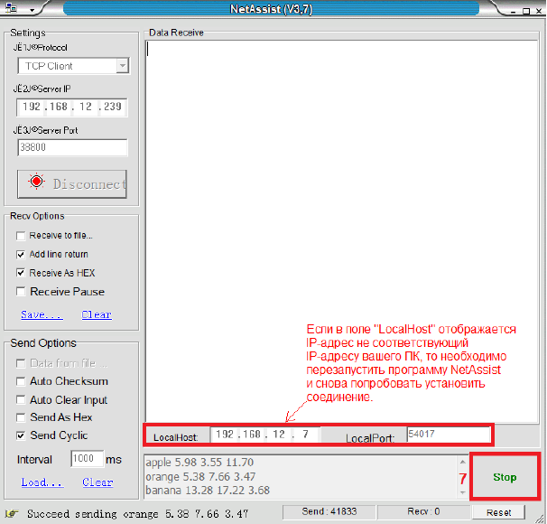 • Если в поле «LockalHost» отображаемый IP-адрес не соответствует IP-адресу вашего ПК, то необходимо перезапустить программу NetAssist.
