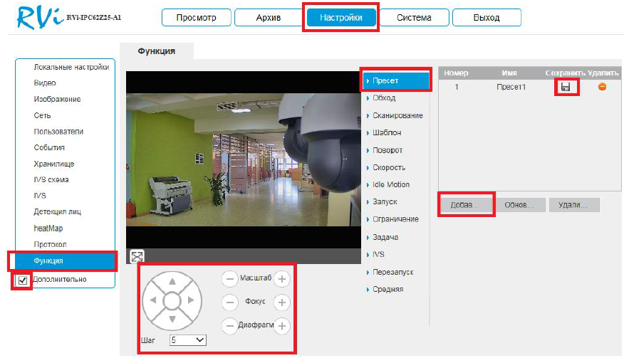 1.1 Откройте веб-интерфейс камеры через браузер Internet Explorer, нажмите «Настройки», поставьте галку «Дополнительно» и выберите пункт «Функция» - « Пресет»