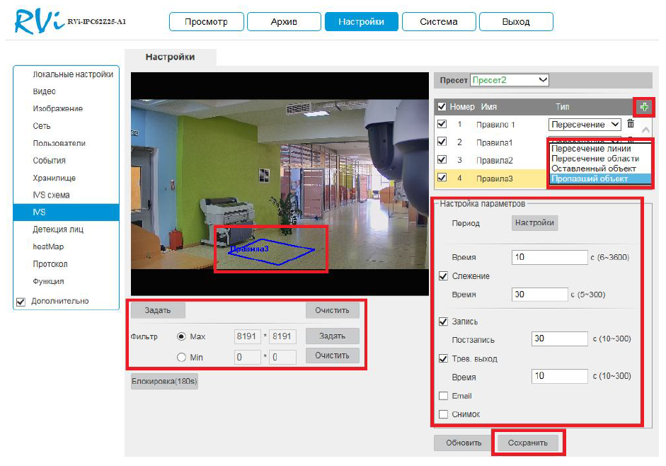 2.6 Пропавший объект. Зеленым плюсом создайте новое правило, тип выберите Пропавший объект», создайте замкнутую область с помощью кнопки «Задать», укажите максимальный и минимальный размер объекта, затем настройте параметры и нажмите «Сохранить».