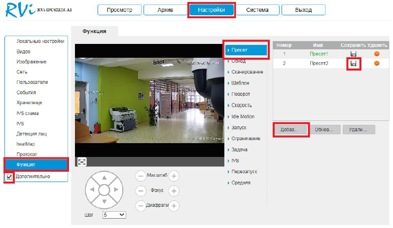 Здесь необходимо создать пресет, для этого с помощью кнопок управления PTZ переместите объектив камеры в нужную точку и нажмите кнопку «Добавить» а затем значок «Дискета» чтобы сохранить пресет.