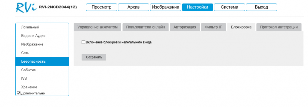 Для того, чтобы подключить камеры 2 серии, к регистратору первой серии требуется предварительно настроить камеру:Сначала перейти в «Настройки» и поставить галочку «Дополнительно», после этого перейти по пути – «Безопасность» - «Блокировка». Необходимо снять галку с пункта «Включение блокировки нелегального входа» и нажать кнопку сохранить.